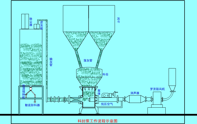 5.气源质量要求不高,系统可靠性高。由低压连续气力输送设备料封泵组成的低压气动连续输送系统具有其他任何气力输送设备组成的输送系统所不能达到的可靠性。低压连续输送系统一般采用罗茨鼓风机(或视情况选用高压离心鼓风机或空压机),罗茨鼓风机的高可靠性决定了系统的可靠性。